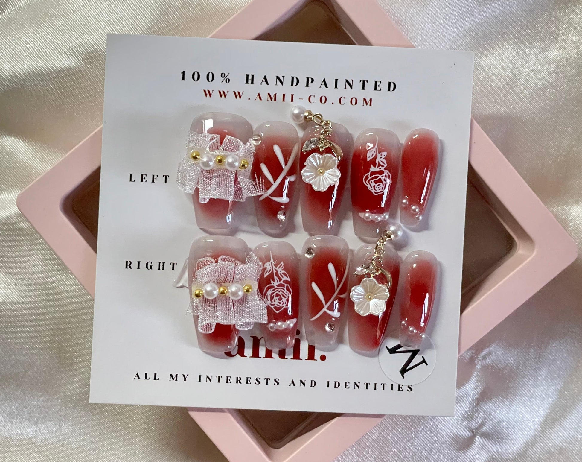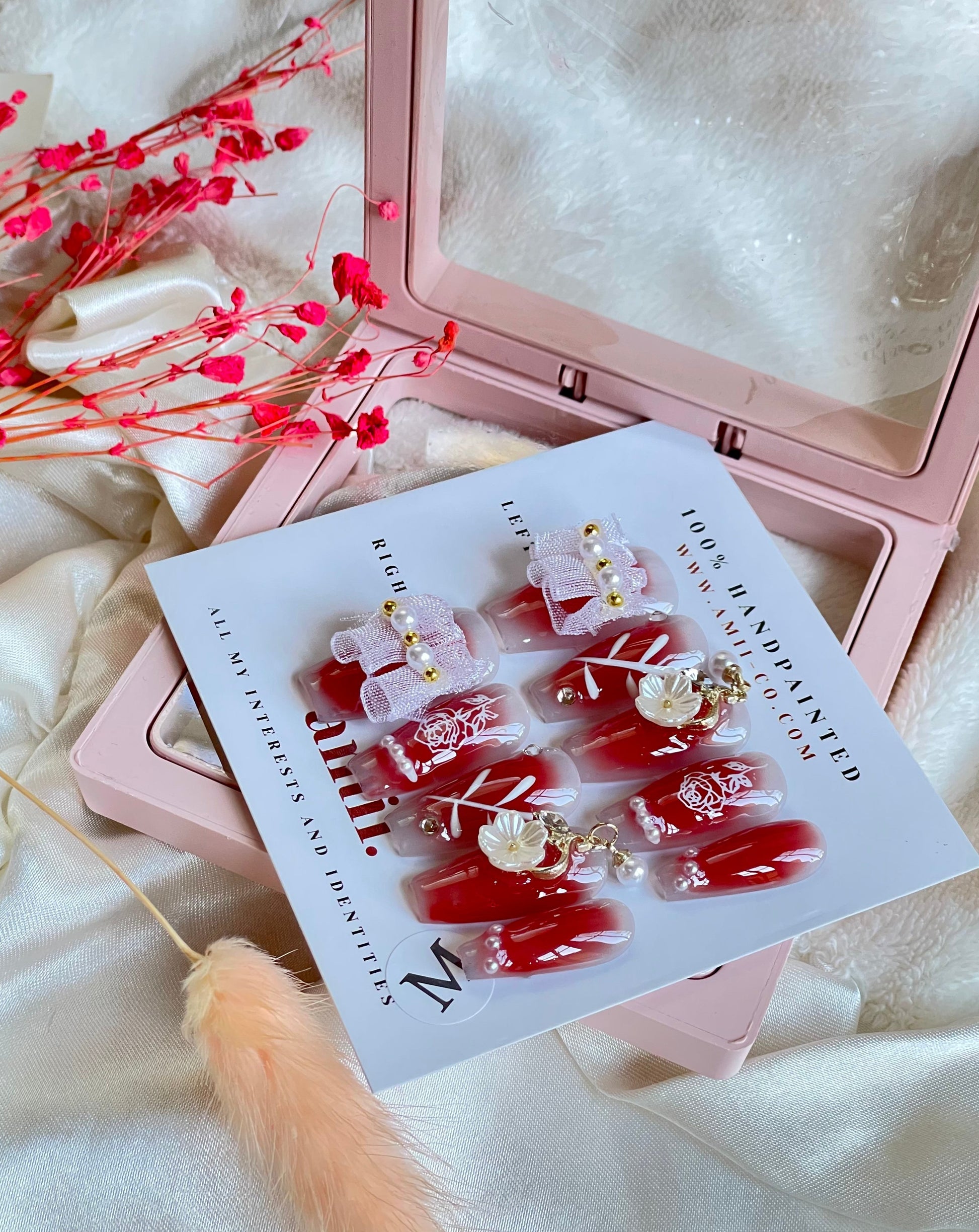 Set includes 10 hand painted press-on nails, a nail file, manicure stick/cuticle push, alcohol prep pad, nail glue, and adhesive tabs (with 6 different nail sizes).